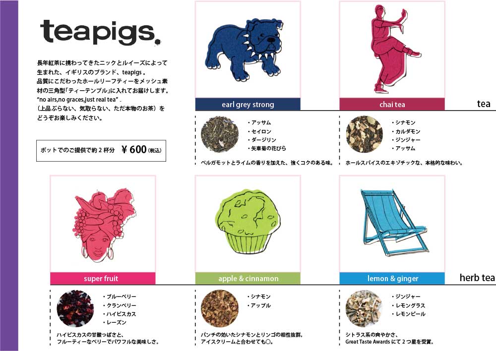 スタッフのイチおし!ドリンクTeapigs 2026.02.10Teapigs,ドリンクメニュー 価格は2026.2.10現在のもの ポットにてご提供。 素材へのこだわりが感じられ、どの紅茶も美味しいです。 ぜひ、ストレートで素材の良さを味わっていただきたいです。